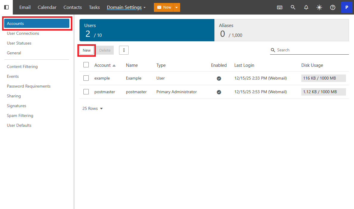 Select Accounts from the left navigation. From here a new account can be created. Click New.