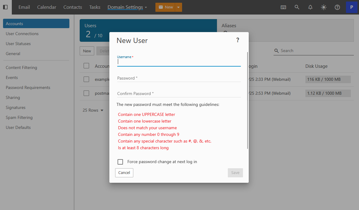 Enter a username and password for the user that meets the password requirements. If you would like to you can also require the user to enter their own password when they first login to the Webmail. When you are done Click Save.